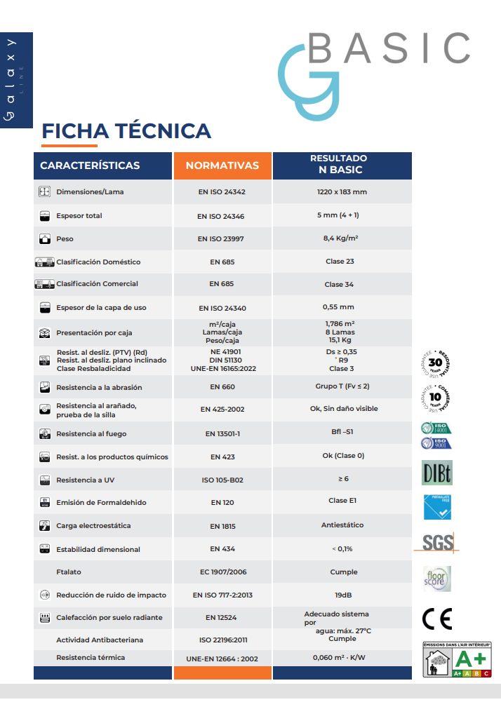 SPC (Stone Plastic Composite). Lamas de medidas standard 100% resistente a la humedad, a diferencia de otros suelos, sobre todo de los suelos laminados, no sufre la más mínima alteración dimensional por efectos de la humedad.