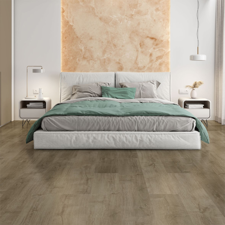 SPC (Stone Plastic Composite). De grandes dimensiones, con mayor espesor tanto en el total de la lama, como en la capa de uso. 100% resistente a la humedad, a diferencia de otros suelos, principalmente los suelos laminados, no sufre la más mínima deformación por efecto de la humedad.